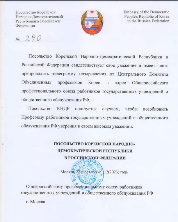 Центральный комитет Объединенных профсоюзов Кореи поздравил Профсоюз со 105-летием